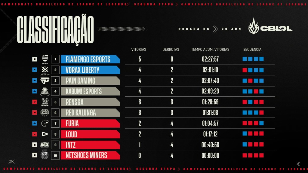 Em mais um domingo (20) de CBLOL, a sexta rodada da competição foi recheada de surpresas. Kabum, Furia, Vorax e Pain venceram os seus confrontos, e com os resultados o campeonato começa a tomar forma. Confira: