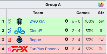 A DAMWON, uma das favoritas ao título do Worlds e atual campeã do torneio, passou em primeiro lugar de forma invicta, ganhando todos os seus seis jogos disputados nesta primeira fase.
