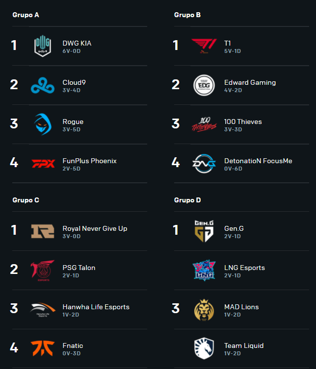 Os japoneses da DetonatioN FocusMe deixaram a competição com um triste 0-6, porém já fizeram história ao serem a primeira equipe da região a sequer chegar na fase de grupos. A 100 Thieves ainda conseguiu surpreender e arrancou uma vitória em cima da EDG, mas o resultado só serviu para garantir a liderança isolada da T1.