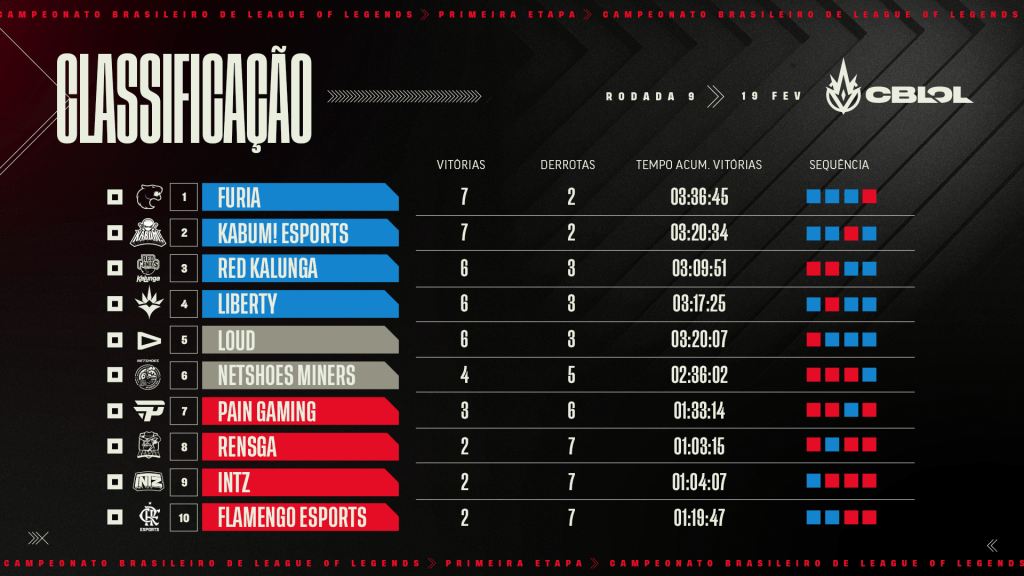 A briga pela liderança do CBLoL continua acirrada. Neste sábado (19), tivemos a nona rodada da competição, na qual a FURIA, que começou a rodada isolada na ponta da tabela, sofreu uma virada da Miners e viu seu rival direto pela liderança, a KaBuM, vencer o Flamengo. Com isso, os ninjas alcançaram os mesmos sete pontos dos panteras, que ainda estão em primeiro pela vantagem no confronto direto.