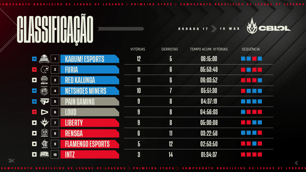 Penúltima rodada de CBLoL e o futuro de três times segue em aberto! Neste sábado (19), tivemos a 17ª rodada do Campeonato Brasileiro de League of Legends, marcada pela disputa entre as últimas quatro vagas para os playoffs por seis times. Dois deles, Miners e RED, garantiram um lugar na próxima fase ao vencerem LOUD e INTZ, respectivamente. Os mineiros demonstraram sua força em rift mais uma vez e atropelaram a Tropa, enquanto a RED venceu, mas deixou a desejar e apresentou um jogo bem abaixo contra os lanternas intrépidos.